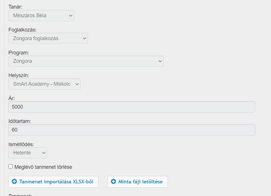- A lap alján a "Minta fájl letöltése" gombra kattintva le tudunk tölteni egy excel fájlt, amelyben el tudjuk készíteni az adott csoporthoz, növendékhez tartozó tanmenetet.