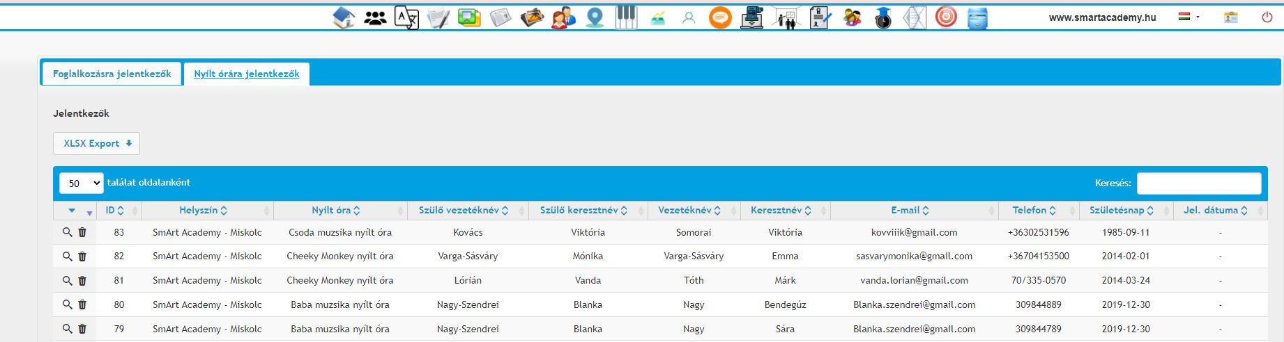 - A legújabb jelentkező található legfelül. Az adatai alapján értesítést küldünk neki e-mailben, vagy telefonon arról, mikorra várjuk Nyílt órára.